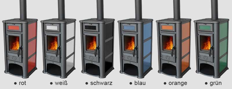 • Der August ist in den Farben rot, weiß, schwarz, blau, orange und grün erhältlich. Darüber hinaus gibt es den Ofen auch mit Seitenplatten aus Sandstein oder Speckstein.