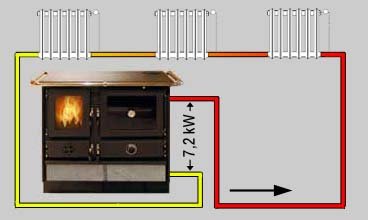 - Die an Wasser bzw. Luft abgegebene Wärme hängt stark von den Bedinungen vor Ort ab: Temperatur-Differenz Vorlauf-Rücklauf, verfeuerte Brennstoffmenge pro Stunde, Einstellung des Zugreglers (langer Abgasweg um die Backröhre = mehr Wärmeabgabe in den Raum, oder kurzer Abgasweg = weniger Wärmeabgabe in den Raum, etc.)