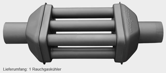 Sie können den Rauchgaskühler für neue oder bereits bestehende Anlagen verwenden. Er kann ganz einfach statt eines herkömmlichen Ofenrohrs eingesetzt werden. Der Rauchgaskühler kann bis zu 2,9 kW zusätzlich an den Raum abgeben!