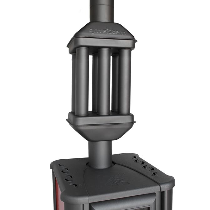 Viele Kaminöfen haben eine sehr hohe Abgastemperatur. Der Abgaswärmetauscher sorgt dafür, dass die Wärme an den Raum abgegeben wird anstatt sinnlos durch den Schornstein nach draußen zu verschwinden.