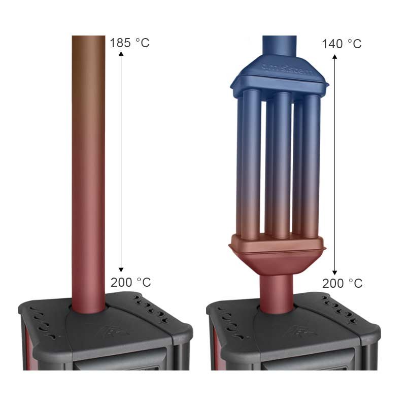Viele Kaminöfen haben eine sehr hohe Abgastemperatur. Der Abgaswärmetauscher sorgt dafür, dass die Wärme an den Raum abgegeben wird anstatt sinnlos durch den Schornstein nach draußen zu verschwinden.
